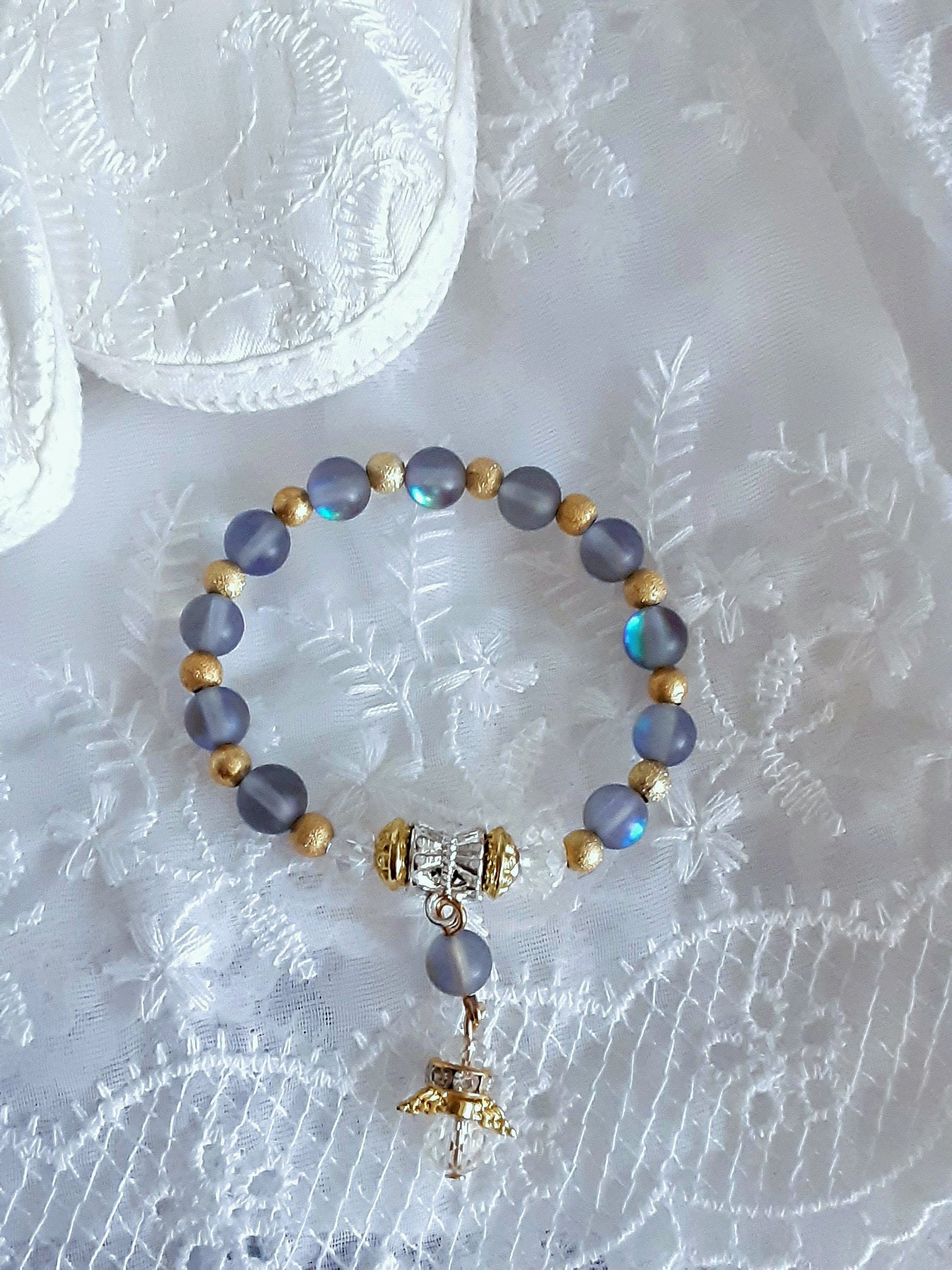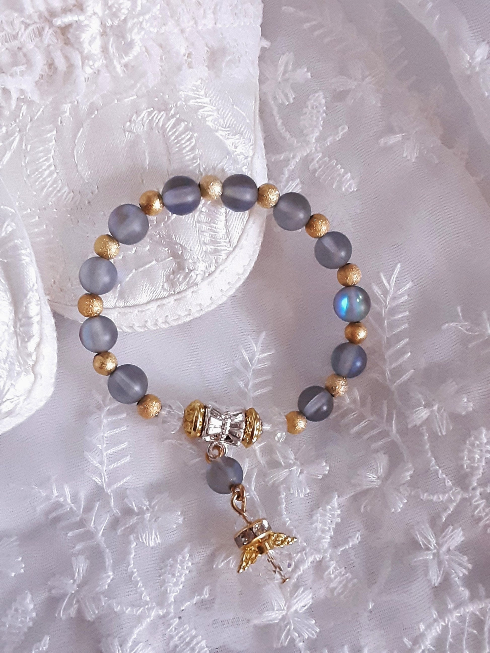This cute little bracelet is made on an elastic wire with 6mm blue/grey Moonstone beads, 4mm gold color sparkly beads, AB crystal angel and a rhinestone ring. A silver color separator holds the crystal angel giving this bracelet the unique mix of gold and silver colors accent.