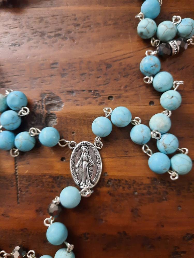 This rosary is made with 53 times 6mm turquoise Howlite gemstones beads, metal beads, black Hemathyte beads, a mother Mary pendant and a 2 inch long metal cross with Turquoise cabuchons .